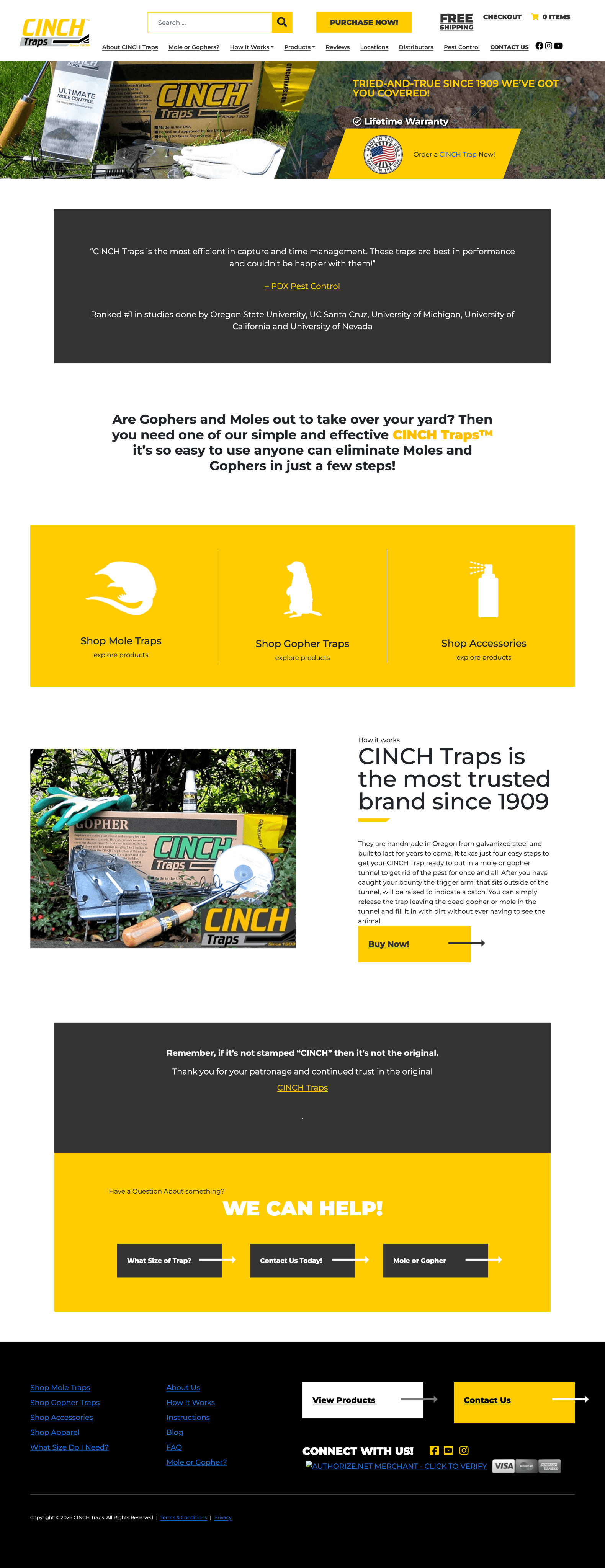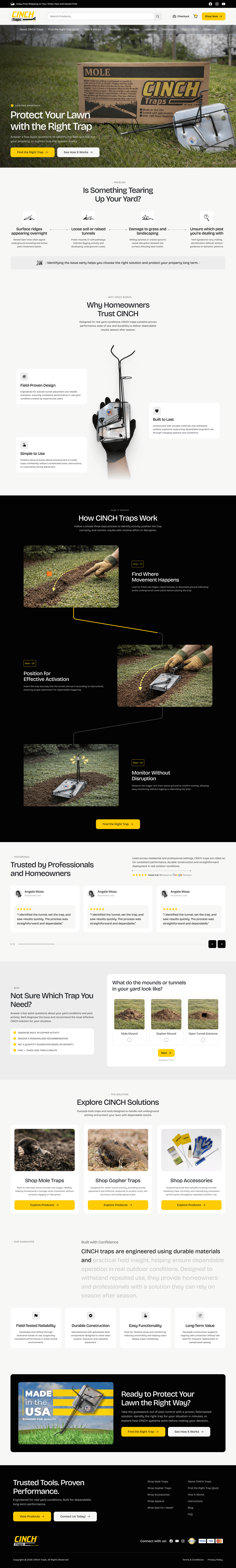 Cinch Traps is a 100+ year–old manufacturer of mole and gopher traps. Their previous website felt cluttered and dated, with heavy blocks of text, confusing navigation, and no clear path for a first‑time homeowner to understand what the product does or which trap to buy. Important trust signals - university rankings, pest‑control reviews, “Made in USA,” and a lifetime warranty - were present but buried.