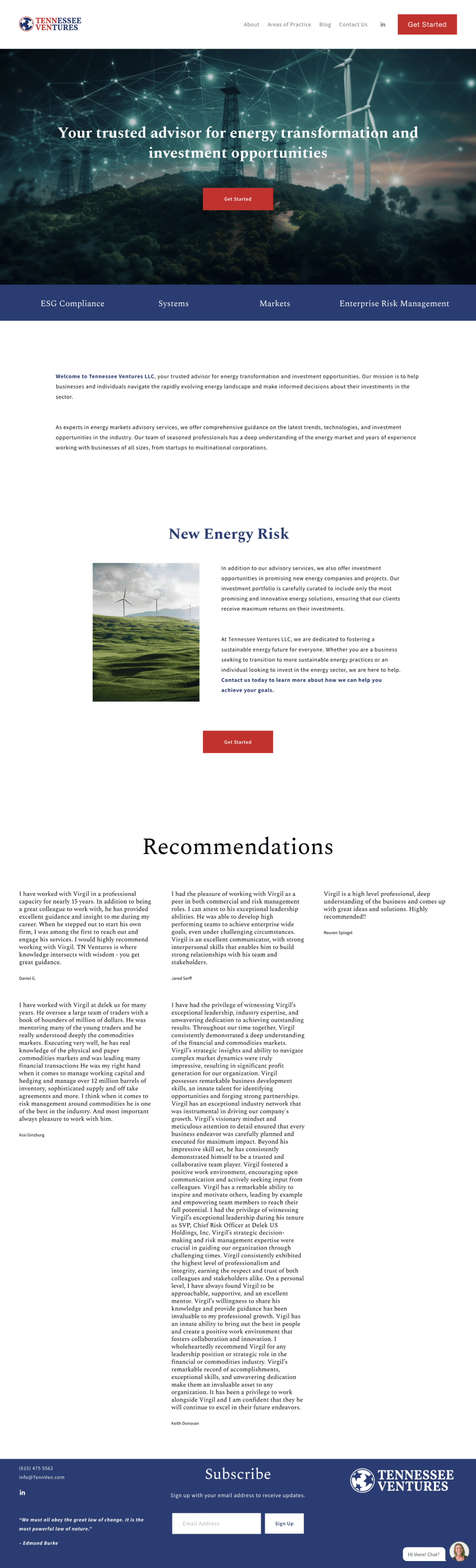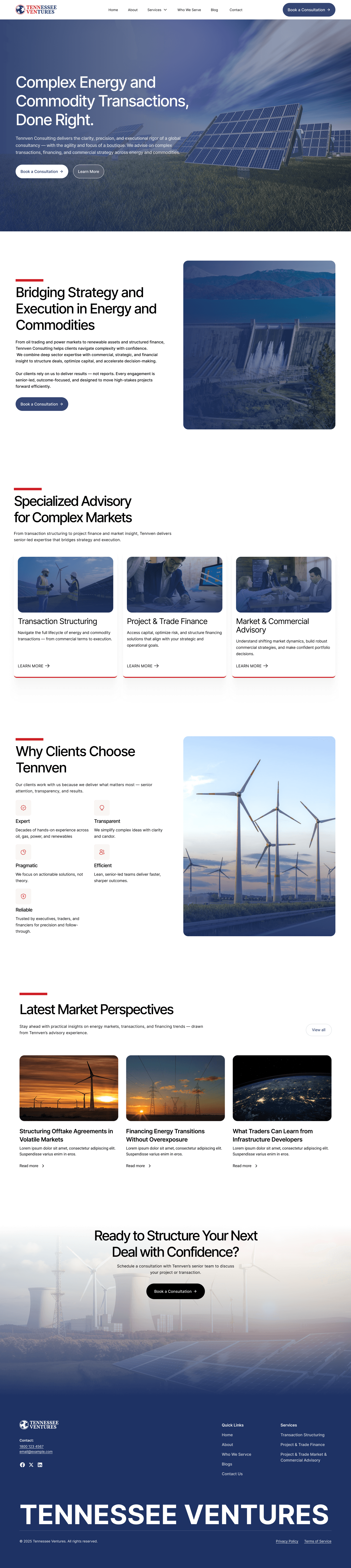 Tennessee Ventures LLC is an energy markets advisory and investment firm helping clients navigate ESG, new energy risk, and enterprise risk management. The legacy site relied on dense paragraphs and long testimonials, which made it hard for visitors to quickly understand what the firm does, who it serves, and how to engage.